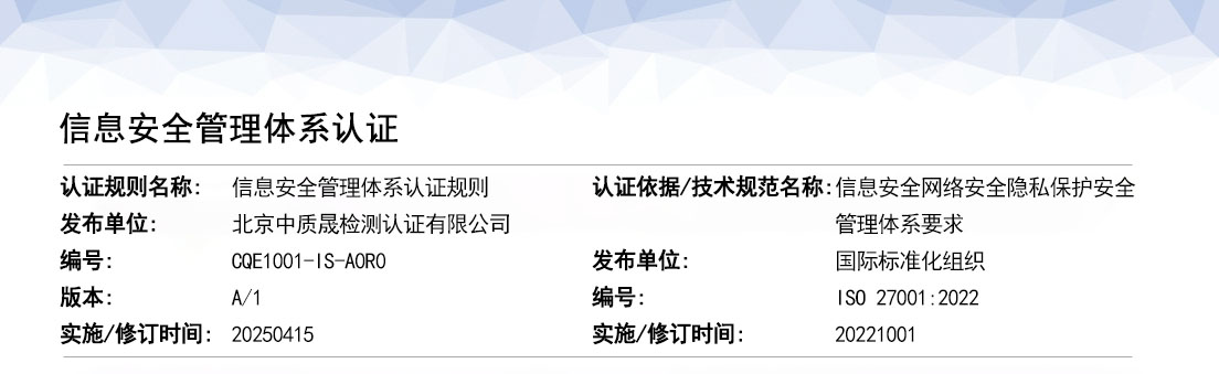 信息安全管理體系標準(ISO27001)可有效保護信息資源,保護信息化進程健康、有序、可持續發展。ISO27001是信息安全領域的管理體系標準,類似于質量管理體系認證的標準。當您的組織通過了ISO27001的認證,就相當于通過ISO9000的質量認證一般,表示您的組織信息安全管理已建立了一套科學有效的管理體系作為保障。